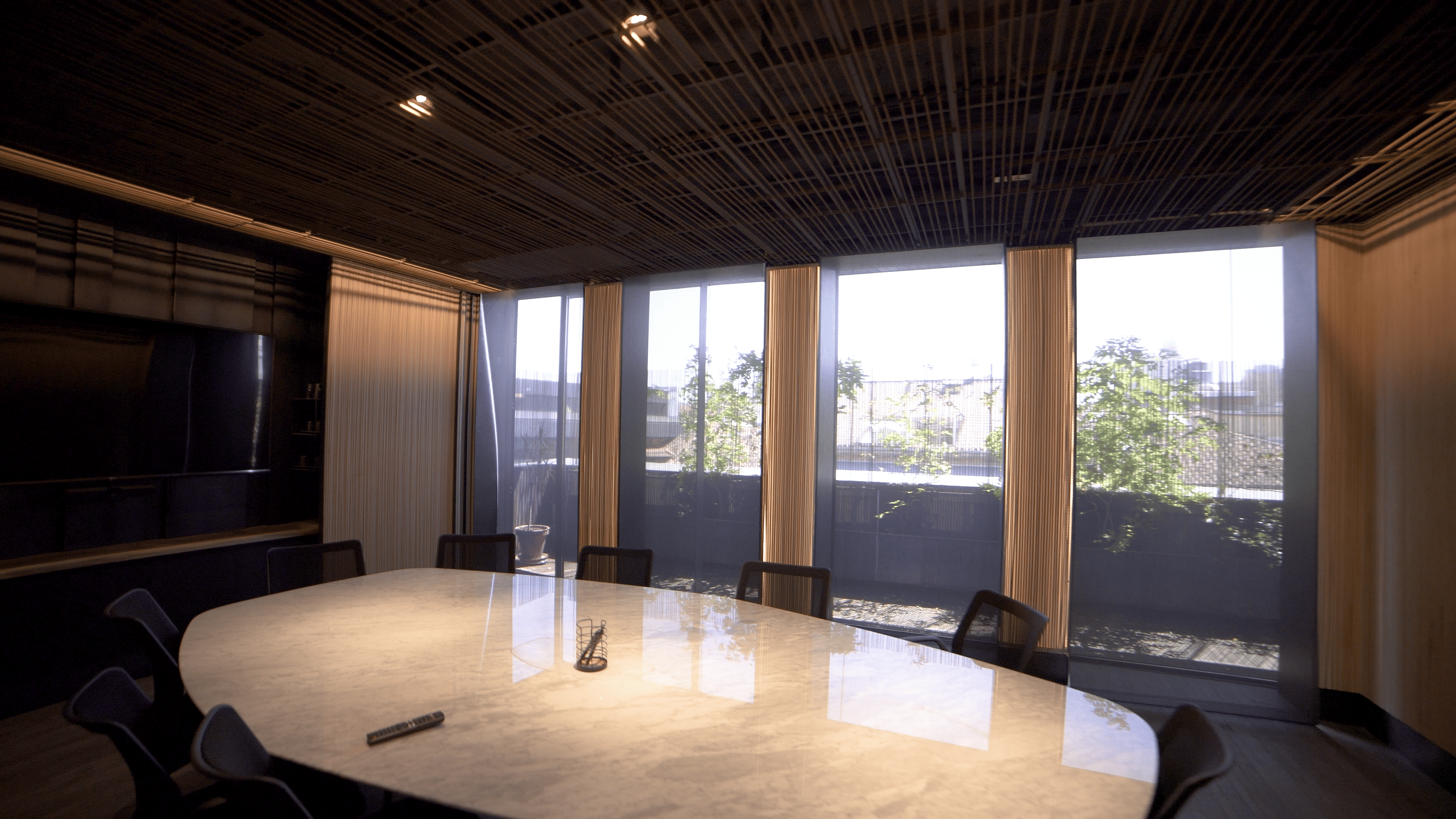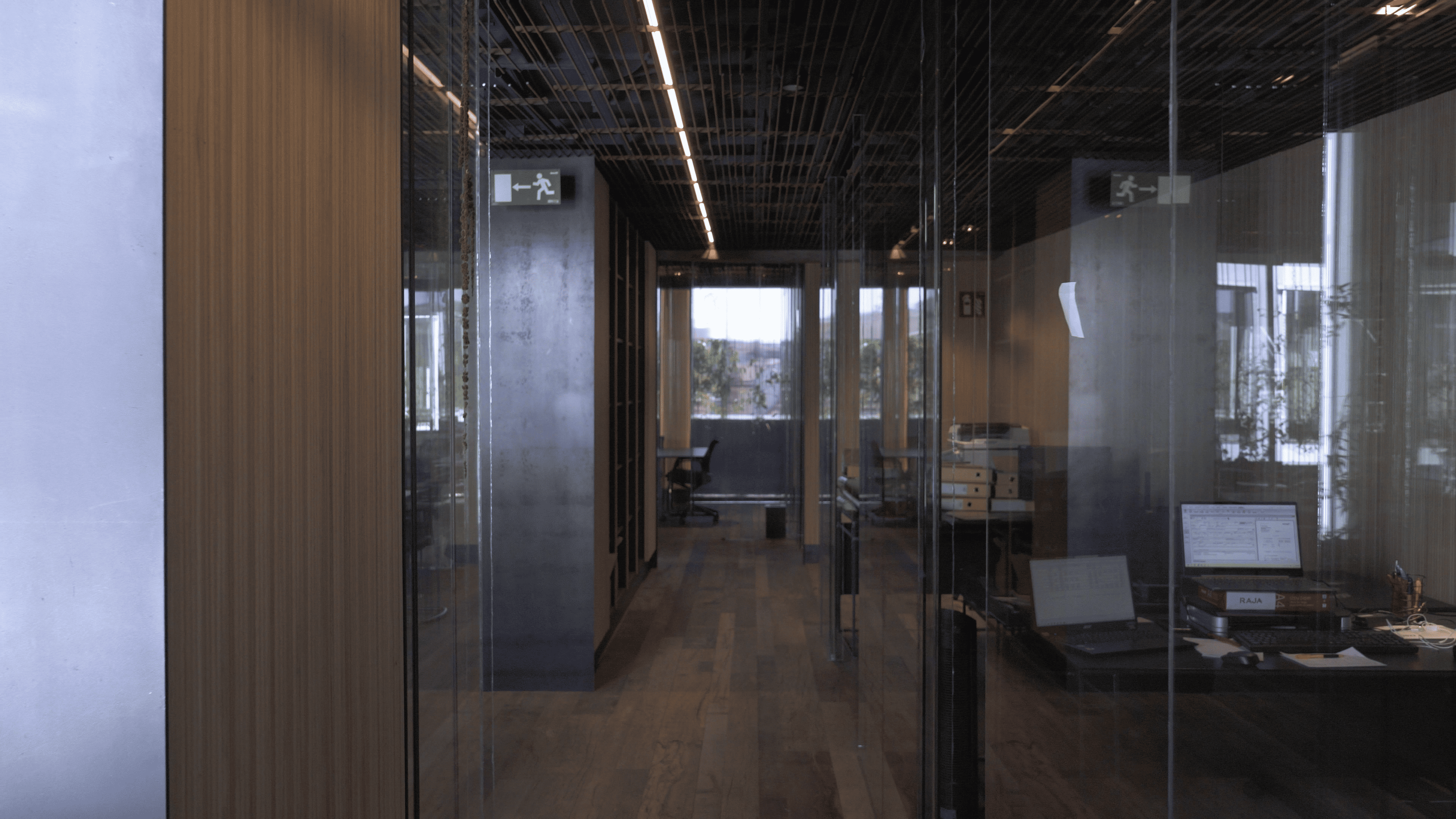 Cuidado de los mínimos detalles en cada rincón de esta oficina donde el vidrio, la madera y la piedra natural combinan a la perfección con el acero en su estado natural.